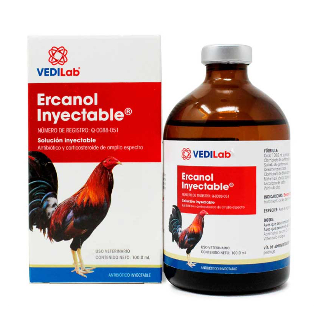 ERCANOL es una combinación efectiva de antibióticos de amplio espectro con un marcado efecto antihistamínico, antiinflamatorio y analgésico. Su formulación permite un tratamiento integral contra las enfermedades respiratorias además del tracto digestivo y urinario en las aves. Esta es una solución basada en dos antibióticos de amplio espectro: oxitetraciclina de gentamicina y añadida con potentes glucocorticoides antiinflamatorios como la dexametasona. El antiespasmódico Ercanol posee propiedades antialérgicas y la presencia de difenhidramina es útil en la descongestión de la mucosa bronquial, nasal y ocular. El ascorbato de sodio estimula las defensas y regenera los epitelios dañados a través de su efecto conocido. Dipirona analgésica y antiinflamatoria voluntad.