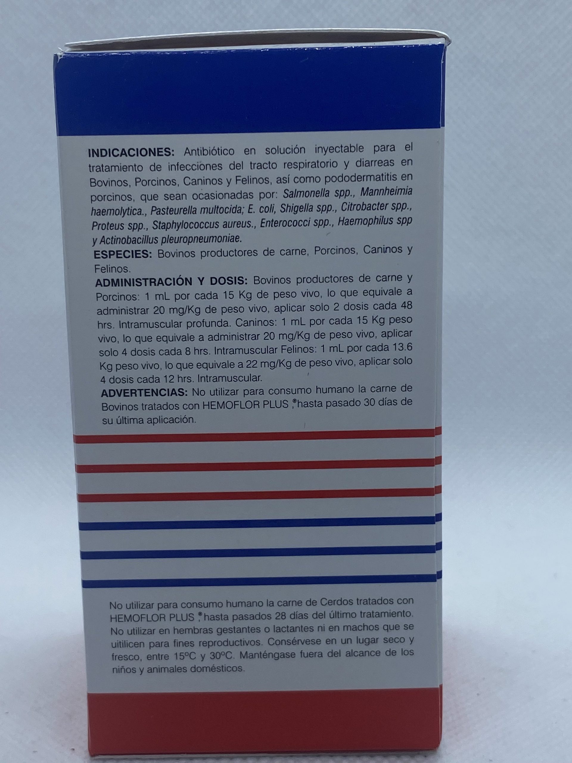 Antibiótico en solución inyectable para el tratamiento de infecciones del tracto respiratorio y diarreas en Bovinos, Porcinos, Caninos y Felinos, así como pododermatitis en porcinos, que sean ocasionadas por: Salmonella spp., Mannheimia haemolytica., Pasteurella multocida; E. coli, Shigella spp., Citrobacter spp., Proteus spp., Staphylococcus aureus., Enterococci spp., Haemophilus spp y Actinobacillus pleuropneumoniae.