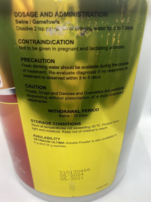 Swine, Poultry and Fighting Cocks – 5 g per gallon of drinking water for 3-5 days.