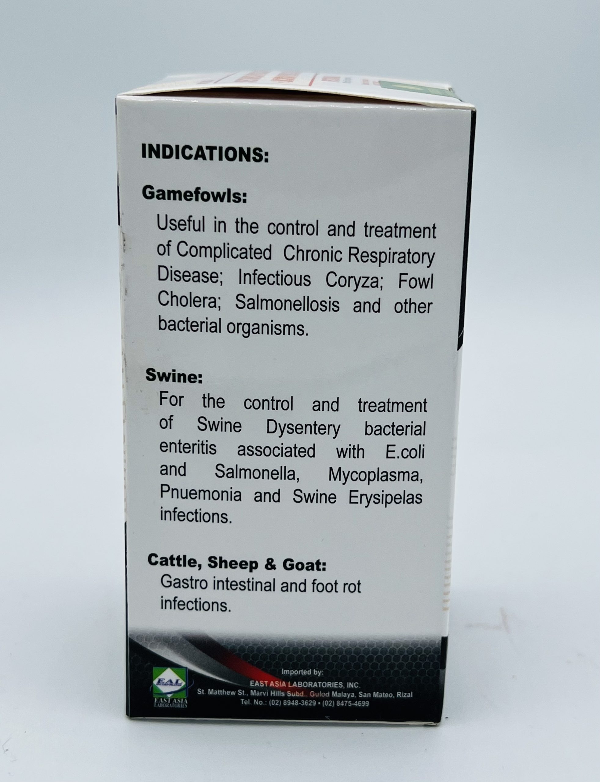 Useful in the control and treatment of complicated chronic respiratory disease (CRD), infectious Coryza, fowl Cholera, Salmonellosis and other bacterial organism.