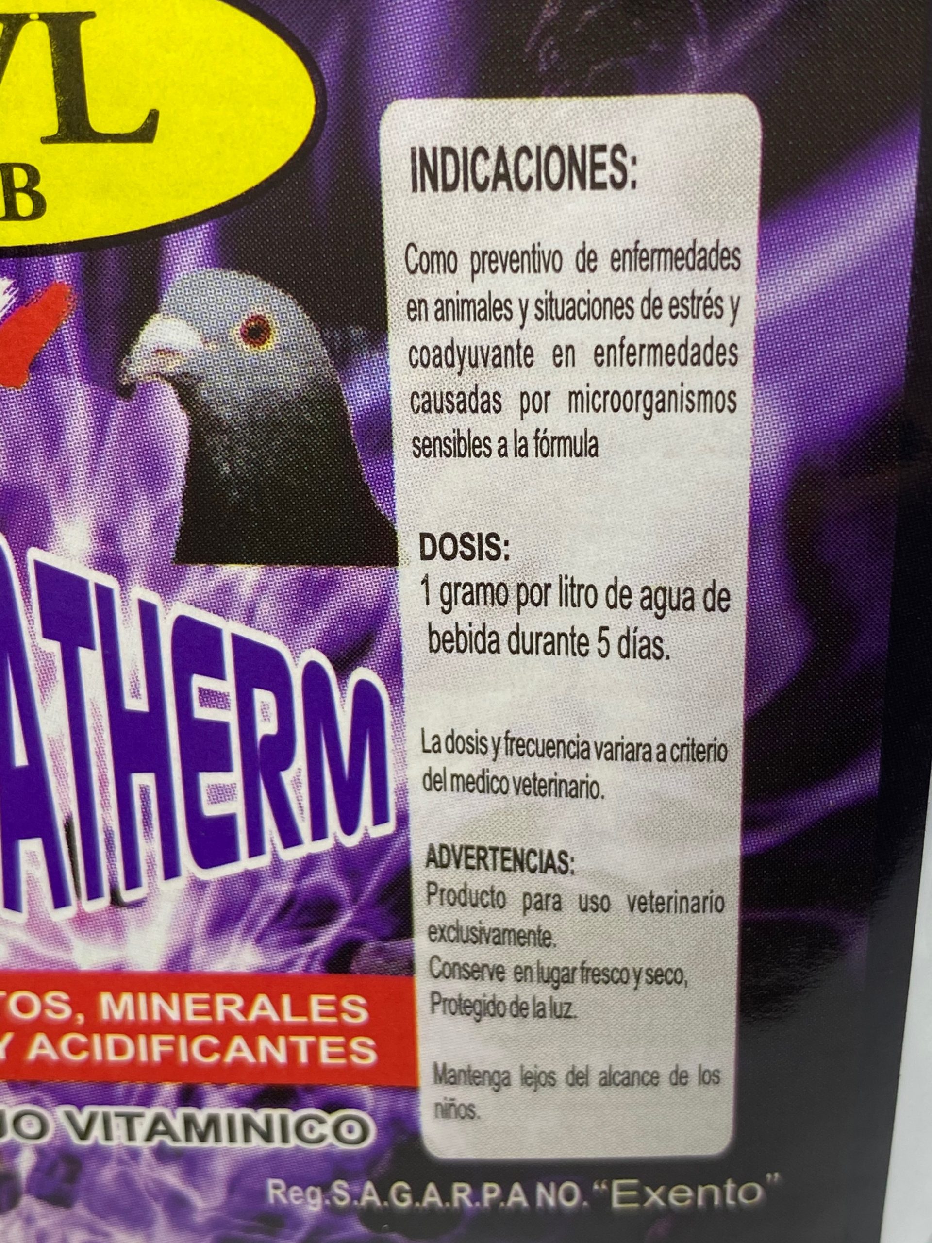 Poderosa formula contra factores indeseados por calor extremo, disminuye los efectos por calor intenso en pollitos, reproducción y cuido, menos jadeo y pérdida de minerales, hidrata y alivia, elimina perjuicios de estrés por calor.
